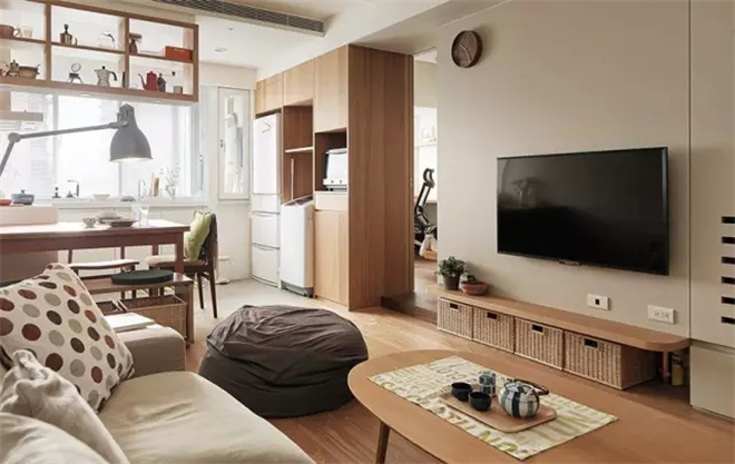 木質的柜子更具有生活的氣息,旁邊就是通往臥室的門,推拉式的木門
